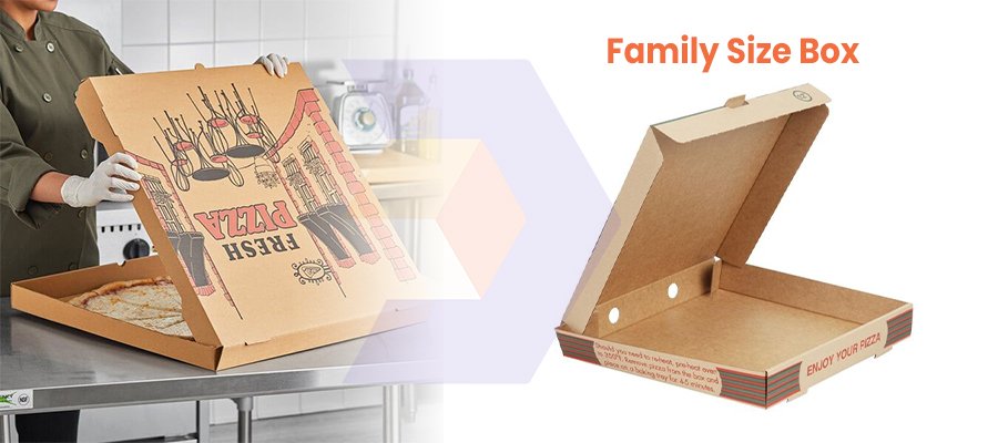 If you want to pack party, restaurant, and jumbo size main pizzas, then you will have to choose family size or big pizza boxes. In these boxes, you can pack pizzas ranging from 18 inches to 20 inches.