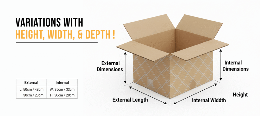 For corrugated boxes, the thickness of the fluting can add millimeters to the external size, making external measurements unreliable for fitting.